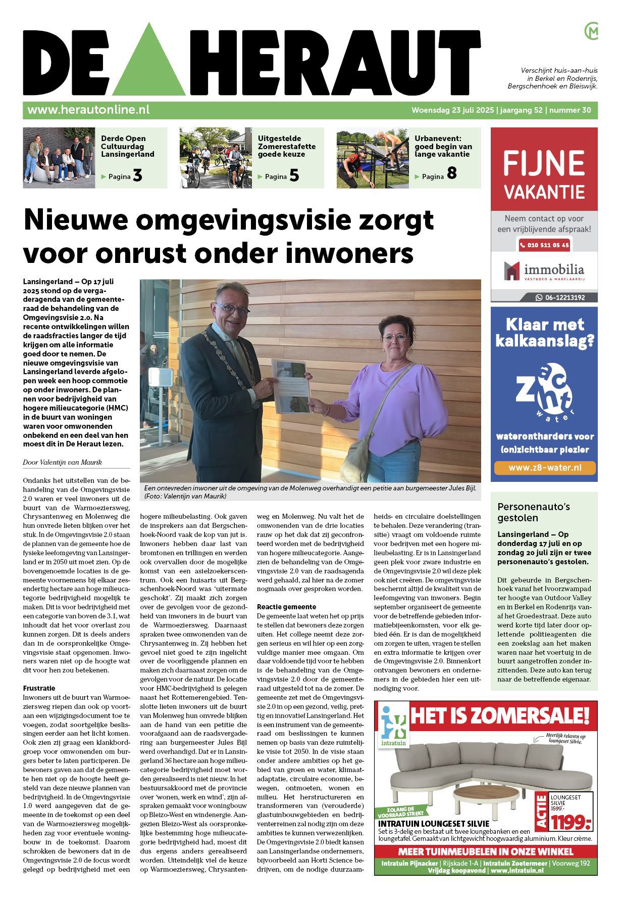 In de Heraut van 23 juli 2025 wordt verslag gedaan van de raadsvergadering van 17 juli waar de behandeling van de Omgevingsvisie 2.0 van de agenda is gehaald op het laatste moment.