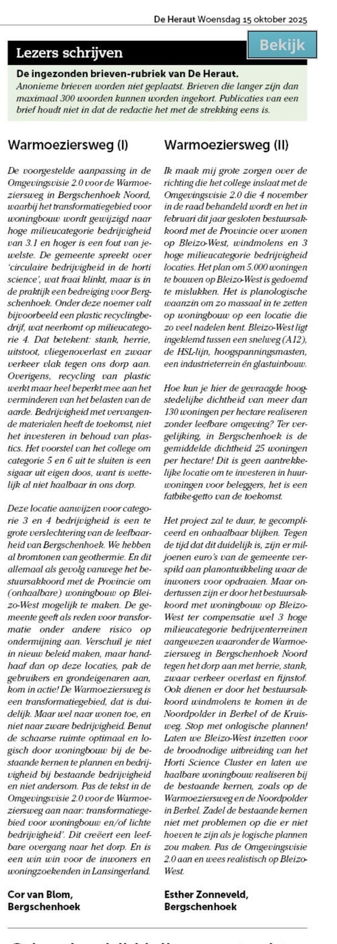 In de Heraut van 15 oktober 2025 zijn 2 ingezonden brieven te lezen over de Warmoeziersweg.